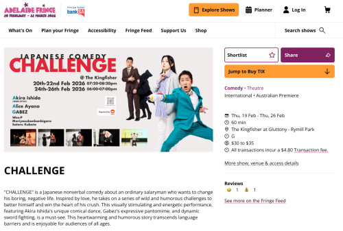 そして今年は 吉本興業のコメディーショー『Challenge』がアデレードフリンジで初公演ということで、19日のプレ公演を観劇してきました。