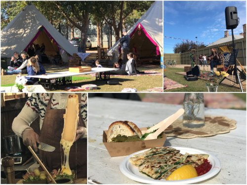 マーケット自体は建物の中なので寒い日や天気の悪い日でも十分に楽しめますが、私たちがでかけた日はとても天気がよく、たくさんの人やワンちゃんたちが芝生でのんびりしていました。カラフルな絨毯やクッション、ベルテントもかわいい♡私たちもマーケットで購入したあっつあつのラクレットチーズフォンデュと、こちらもチーズとほうれん草たっぷりのトルコのフラットブレッドをゲットして青空の下ランチタイムです。Live Musicもボサノバ系でとても落ち着きます。