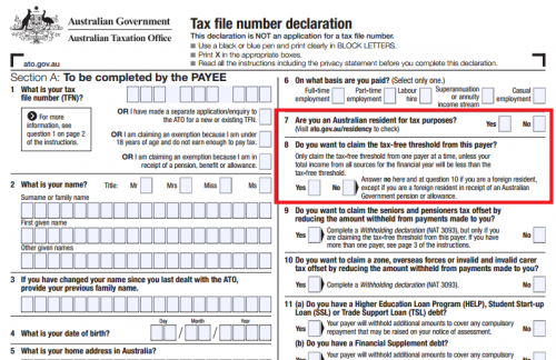 Tax File Number Declaration- #7 ⇒ Yes(税法上の居住者ではある)