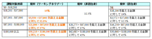 同時に複数の仕事を掛け持ちしても、それぞれ源泉徴収される所得税は所得税率表(ワーキングホリデー用)どおりです。ただし、タックスリターン時には合計所得金額で再計算されます。なお、ワーキングホリデー雇用のための登録をしていない雇用主の元で働く場合には所得税率表(非居住者用)の税率で源泉徴収されます。