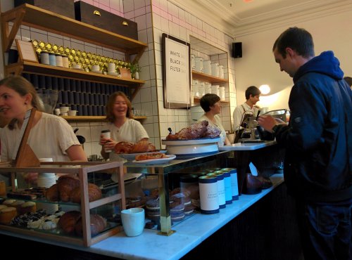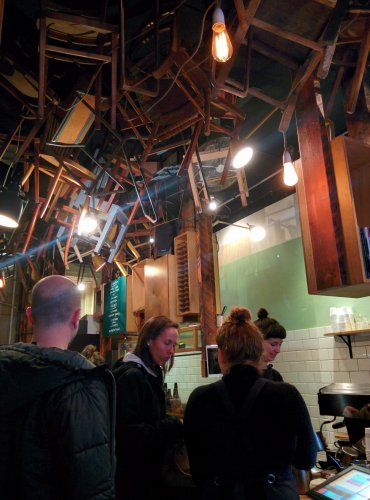 天井がから椅子がぶら下がってるユニークなカフェ。店内はものすごく狭いので基本テイクアウェイ。コーヒーは大好きなだけで全然詳しくないのですが、香りがストロングな感じですごく美味しかったです。濃いめが好きな方にオススメ。