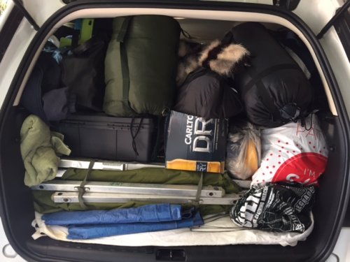 テントに寝袋なので、出発前の車はこんな感じです。