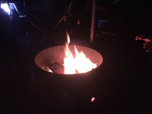 夕飯は焼きそばを作り、夜は焚き火を囲みながら、ワイン!