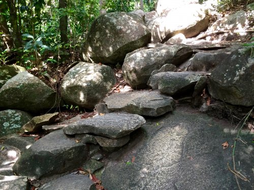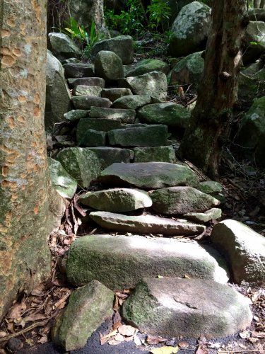 並べか方が雑な岩の道は傾斜も急で、両手を使いよじ登り、また足が滑らないように細心の注意を払いながら進んでいきます。