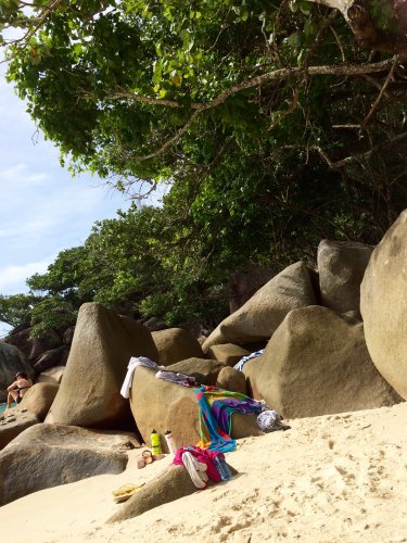 みんなこのように荷物は置きっぱなしで海に入ります。離島だから安心です。私も普通に荷物を置いて海へ!