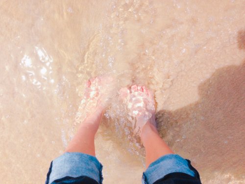 ビーチから上がれるほとんどの場所に足洗い場付きのシャワーが設置してあるので、ビーチサンダルはもちろん、靴で行っても大丈夫。乾いた白い砂は粒子が細かい鳴き砂で、裸足で歩くとキュッキュッと可愛い音がして楽しいですが、歩きづらいし、日差しが強い日にはとても熱くなるので、やはりビーチウォークは波打ち際がベスト。気温はだいぶん高くなり、30度を超える日もでてきましたが、まだ海水は冷たく感じる日もあります。でも、足を浸けるだけならとても気持ちがいいです。