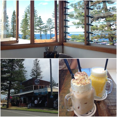 アフターヌーンティに選んだのはまさにクイーンズランド最南端のカフェD Bar。州境にある灯台のすぐそばにあります。眺めもいいので私達は2階席へ。フレンドリーで元気な店員さんが迎えてくれます。お散歩で少し汗をかいていたので、アイスコーヒー(アイスクリームとホイップクリームがのったカフェオレみたいなもの)を注文。Mちゃんはマンゴーメインのスムージー。