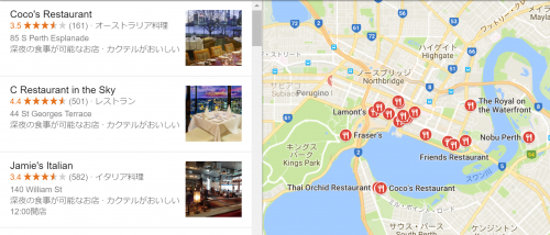 例えば、グーグルで「Perth Restaurant」と検索をするとこんな感じお店が表示され、口コミ情報も見ることができます。
