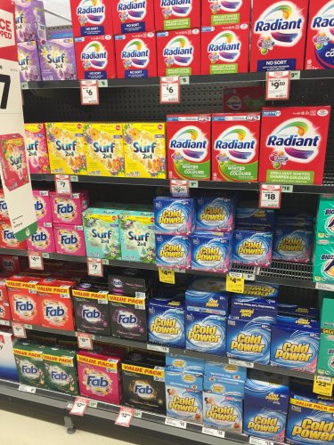 日本では見たことのない洗剤も、オーストラリアでは販売されているわけですが、最近、足を運んだWoolWorth(スーパーマーケット)では、こんな感じです。
