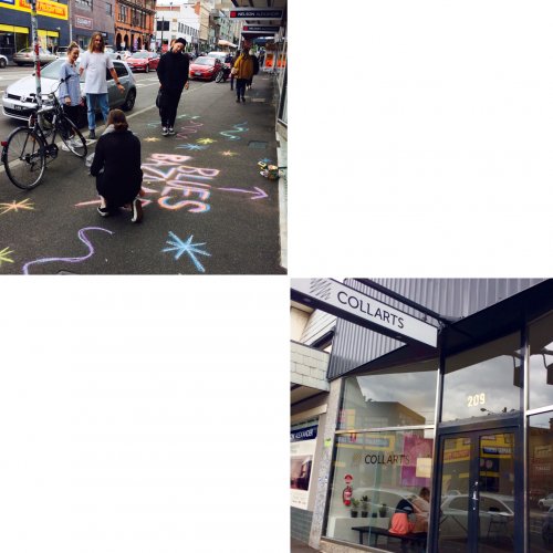 2人に出逢ったのはフィッツロイ、ブランズウィックストリート沿いにあるCOLLARTSの前。なにやらチョークで楽しそうに路上に絵を書いている模様。気になって話しかけたのですが、なんとこちらのスペースは大学の施設なのだそう!2人はそこの学生さん。