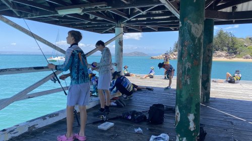 地元の学校の子達は先生から釣りの仕方や魚の種類を習っていました。