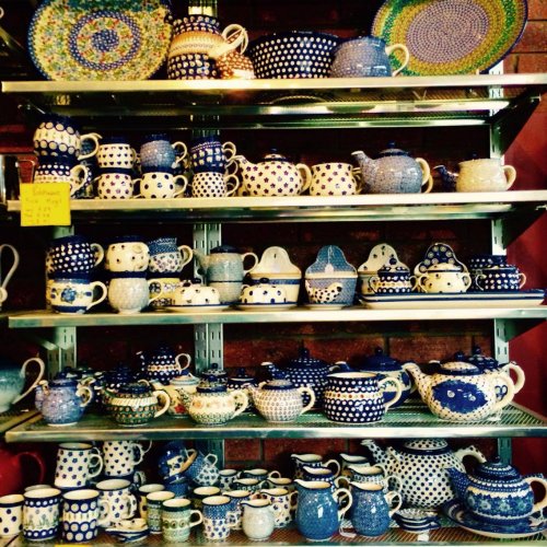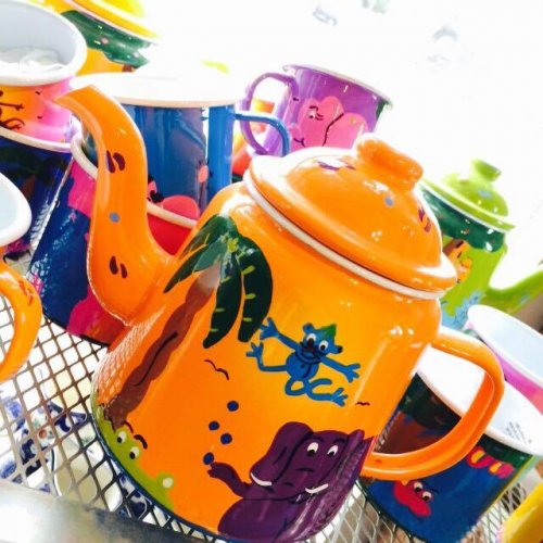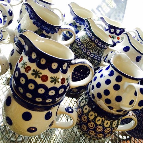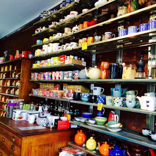綺麗なデザインのカップやソーサー、コーヒーメーカーなどが並べられています。