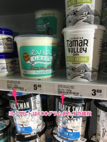 オーストラリアでは値札に、容量や個数などを元にした「値段」が記載されています。