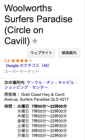 日曜日のパースのWoolworthは11時〜17時の営業時間に対し、サーファーズパラダイスは8〜20時!なんと!6時間も長く開いてるー!すごいー!パースっ子の私はその営業時間の長さに感動。笑