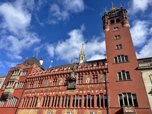 旧市街でひときわ目立つ赤い建物はバーゼル市庁舎言語学習者同士の小さな国際交流