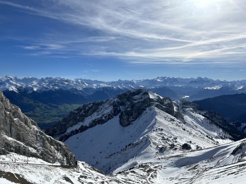 バーゼル駅から高速鉄道と世界最大の傾斜角度を誇る山岳鉄道を乗りついで1時間半。ピラティス山から望む景色は最高でした!