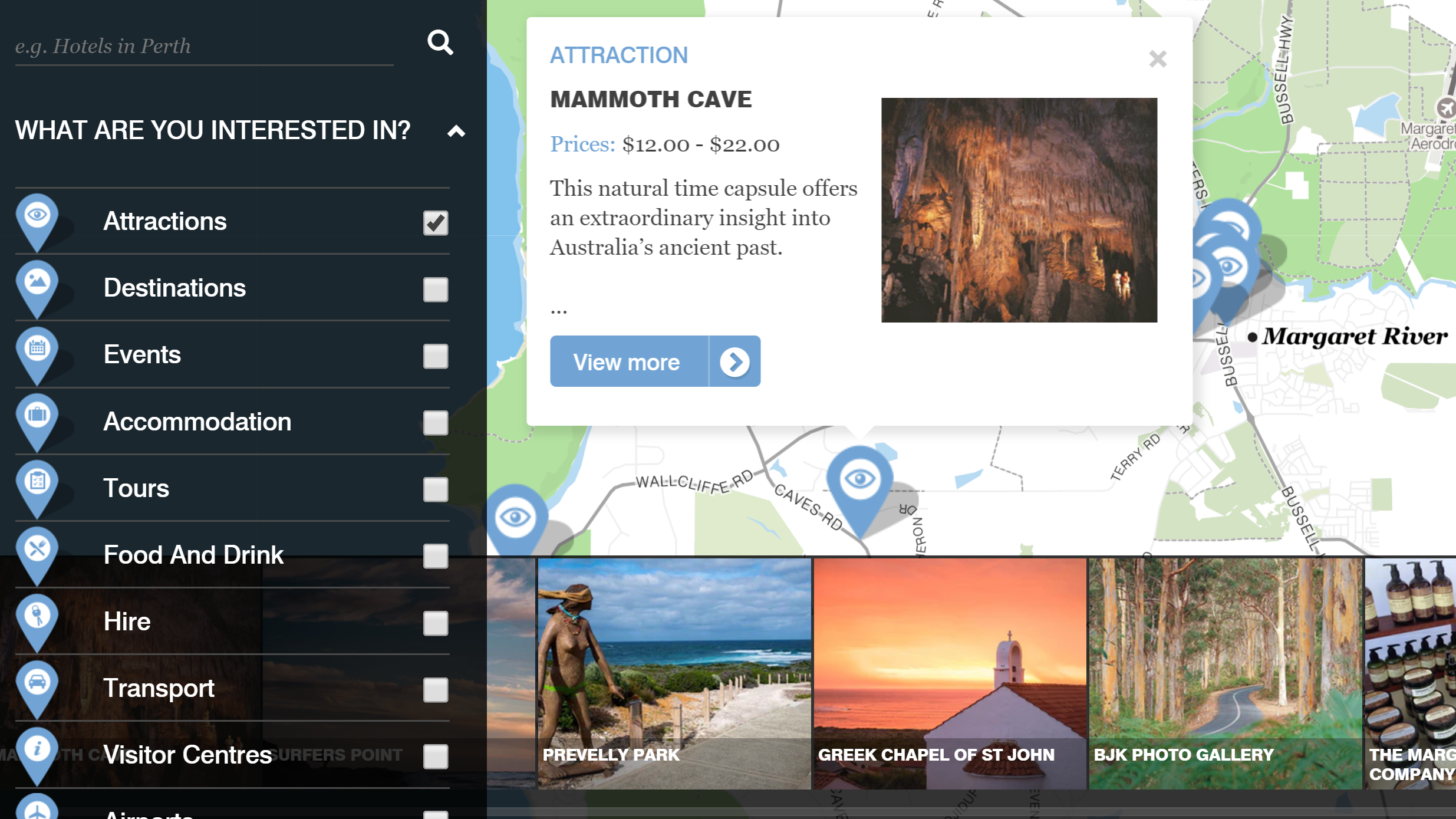 例えば、ワイナリーで大人気の観光地、マーガレットリバーをクローズアップして、左のメニューの「Attraction」にチェックを入れると、周辺地域の見どころスポットが表示されます。そして、各スポットにカーソルを合わせると説明が表示されます。