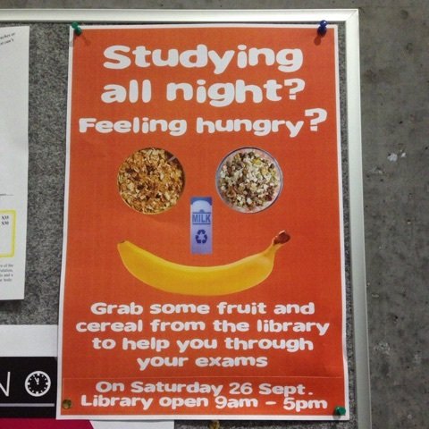 腹が減っては戦(ベンキョウ)はできぬ。遅くまで学校で勉強している学生のために、図書館がフルーツやシリアルを用意してくれているらしいのです…やさしいんだか、もっと勉強しろとケツを叩かれているのか…そんな叱咤激励もあって!?切り抜けた期末テストでした(*^_^*)